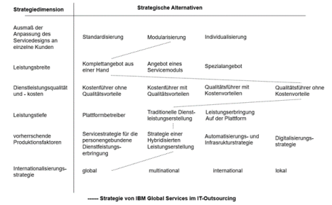 Vergleich von strategischen Alternativen im IT-Outsourcing, einschließlich Standardisierung, Modularisierung und Individualisierung nach Leistung und Kosten.